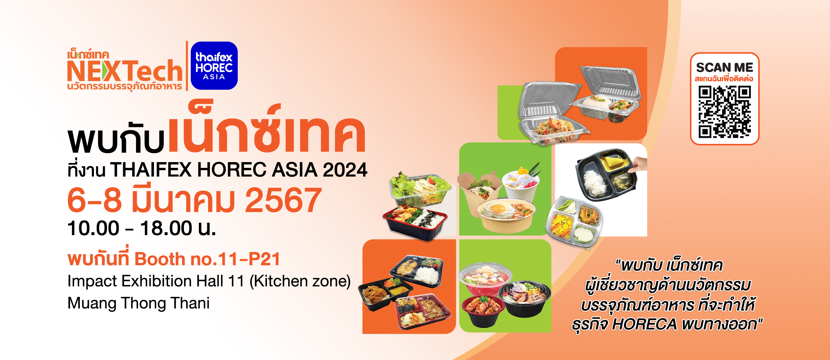 ขอเชิญทุกท่านเยี่ยมชมบูธ NEXTech ที่งาน THAIFEX HOREC ASIA 2024 “พบกับ เน็กซ์เทค ผู้เชี่ยวชาญนวัตกรรมบรรจุภัณฑ์อาหารที่จะทำให้ธุรกิจ HORECA พบทางออก”