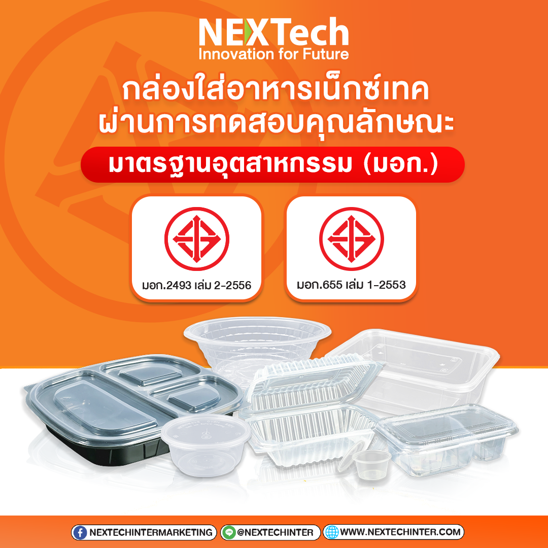 เน็กซ์เทคได้ใส่ใจและตระหนักถึงความสำคัญเรื่องมาตรฐานการผลิตสินค้าและความปลอดภัยของผู้ใช้งาน กล่องใส่อาหารจากโรงงานเน็กซ์เทคผ่านการทดสอบคุณลักษณะ มาตรฐานอุตสาหกรรม (มอก.บังคับ) มอก.2493 เล่ม 2-2556 และ มอก. 655 เล่ม 1 ซึ่งทาง สมอ. ดีเดย์ 3 ม.ค.กำหนดให้ “ภาชนะพลาสติกสำหรับอาหาร” เป็นสินค้าควบคุม ต้องได้มาตรฐาน เพื่อความปลอดภัยของผู้บริโภค คุมเข้มทั้งผู้ผลิต ผู้นำเข้า ผู้จัดจำหน่าย หากฝ่าฝืนมีโทษตามกฎหมาย ดังนั้นจึงมั่นใจได้เลยว่า ถ้าใช้กล่องใส่อาหารจากโรงงานเน็กซ์เทค ถูกกฏหมาย ปลอดภัย เพราะได้คุณภาพมาตรฐานการผลิตจาก มอก.